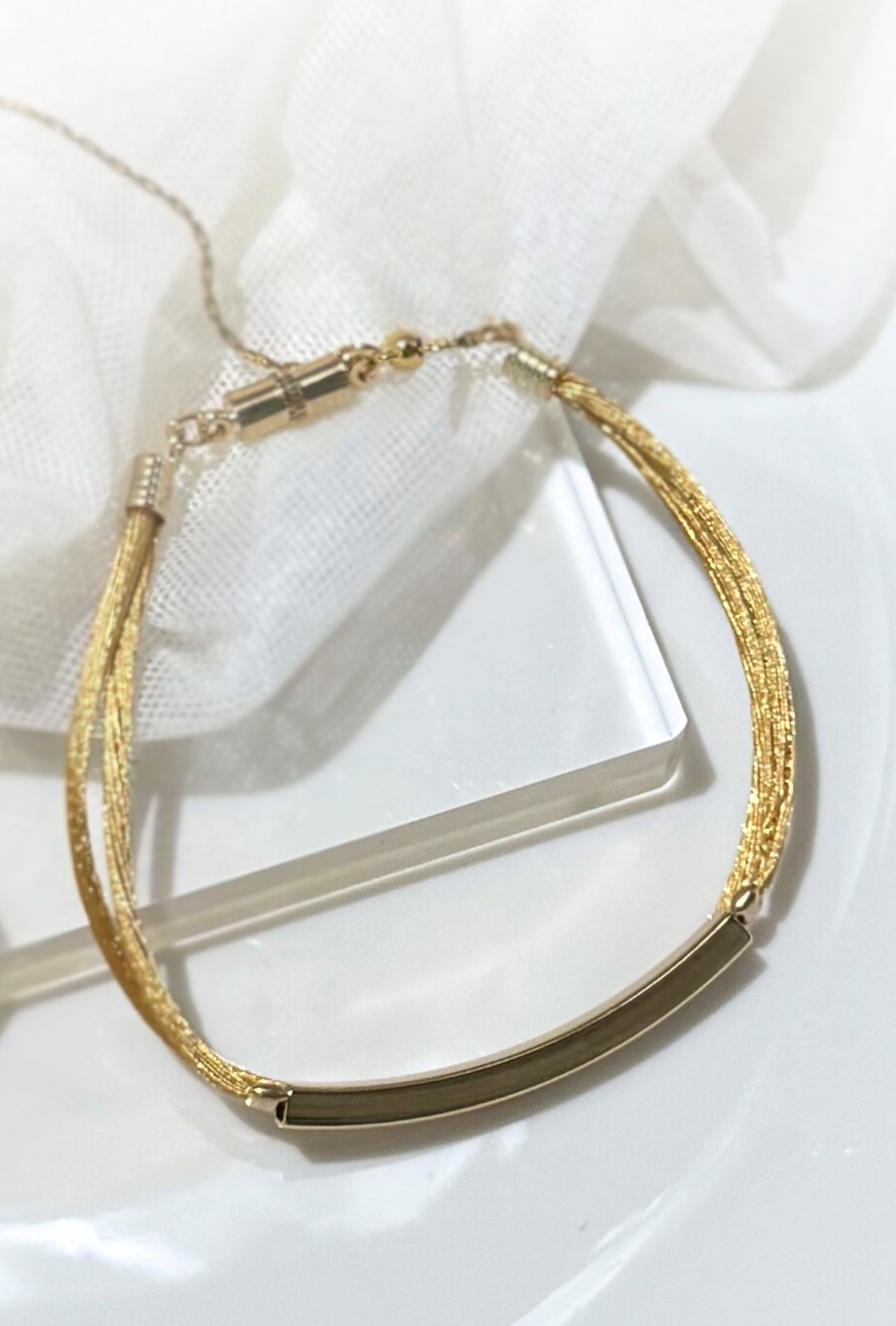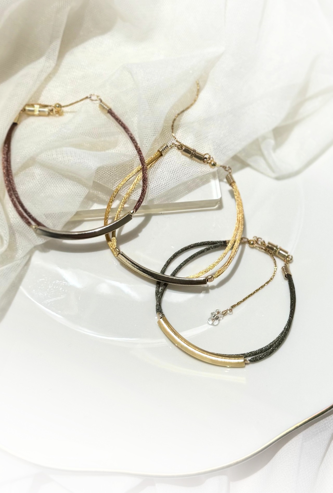 ・ボリュームのあるバングルや腕時計と重ね着けする場合は、少し短めに手首のサイズ丁度でご着用いただくのがおすすめです^ ^
