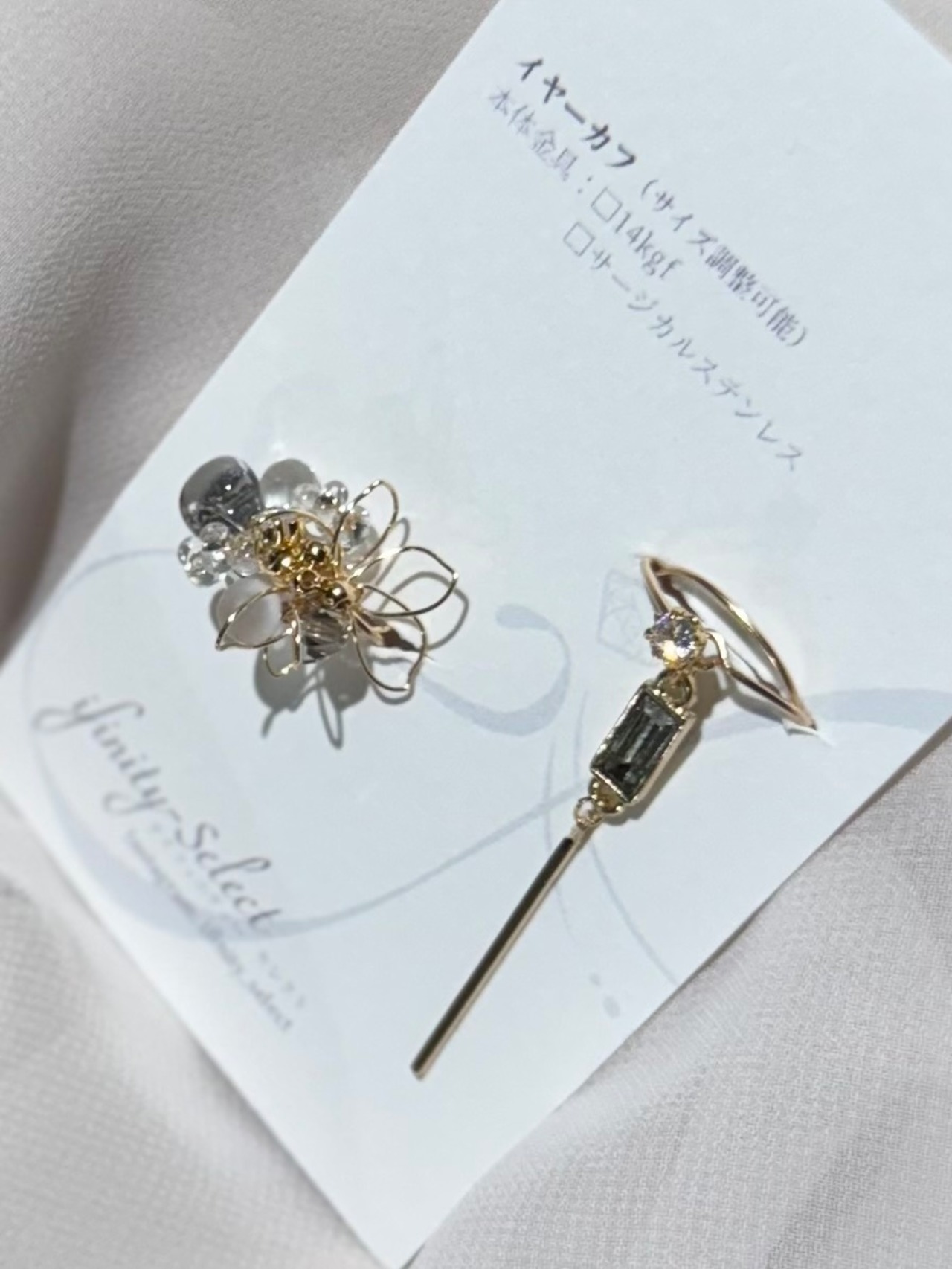 当店のイヤーカフは痛くなく、サイズ調整が出来て落としにくい為、お出掛けの日も着けている事を忘れる程の軽い着け心地。