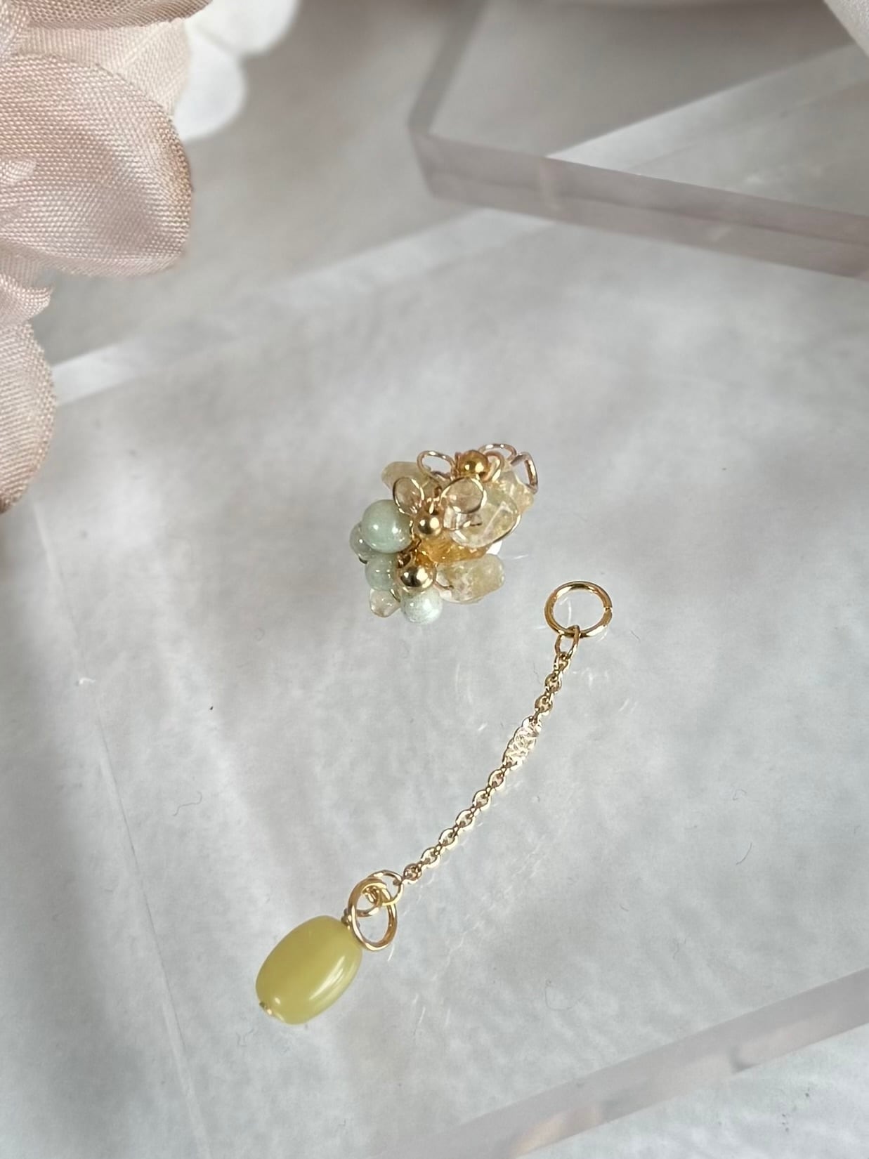 ミモザの蕾と緑の葉を一つのビジューで表現したイヤーカフ。