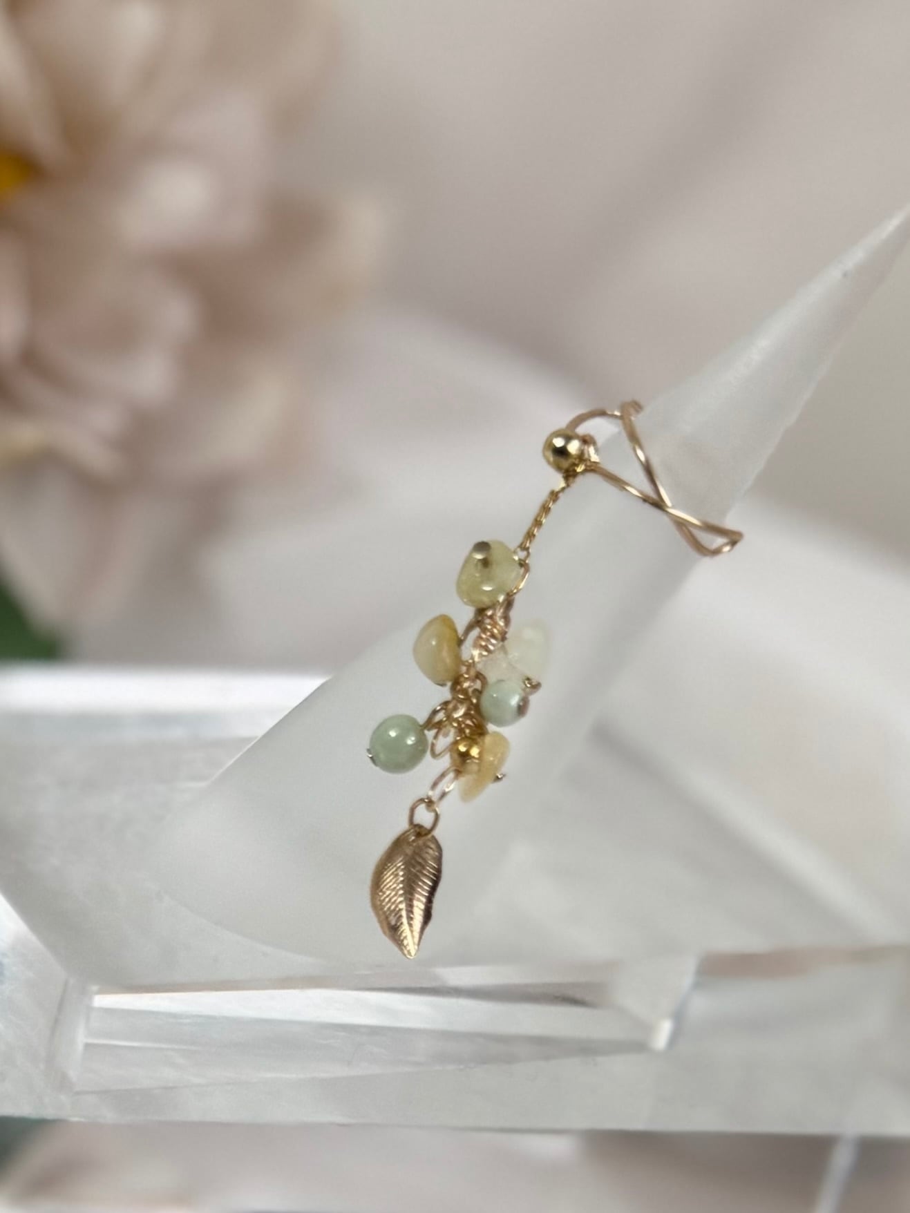 1番下で揺れるゴールドリーフのチャームがふわふわ感を少し引き締めてくれる、ワンポイントになっています。