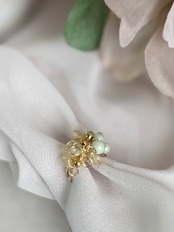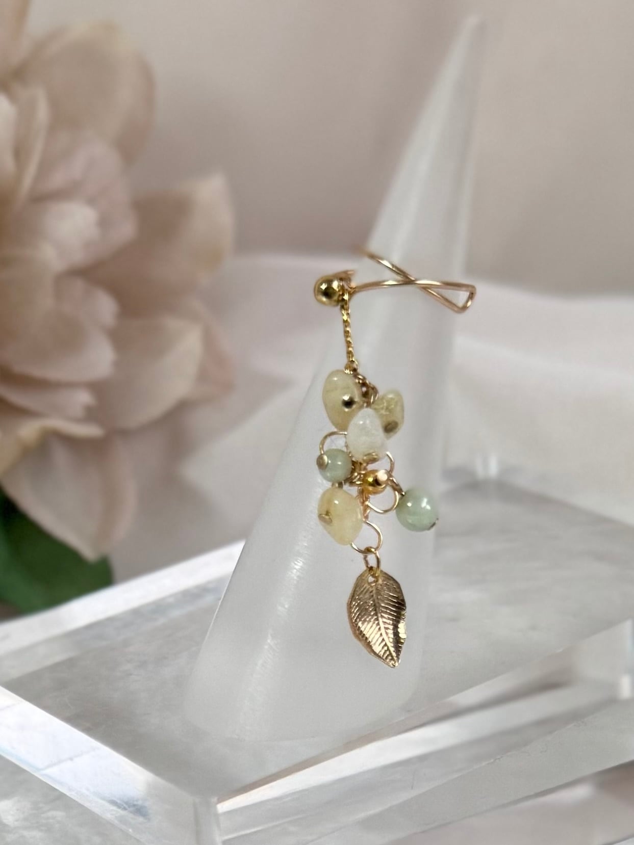 ミモザの蕾と緑の葉を一つのビジューで表現したイヤーカフ。