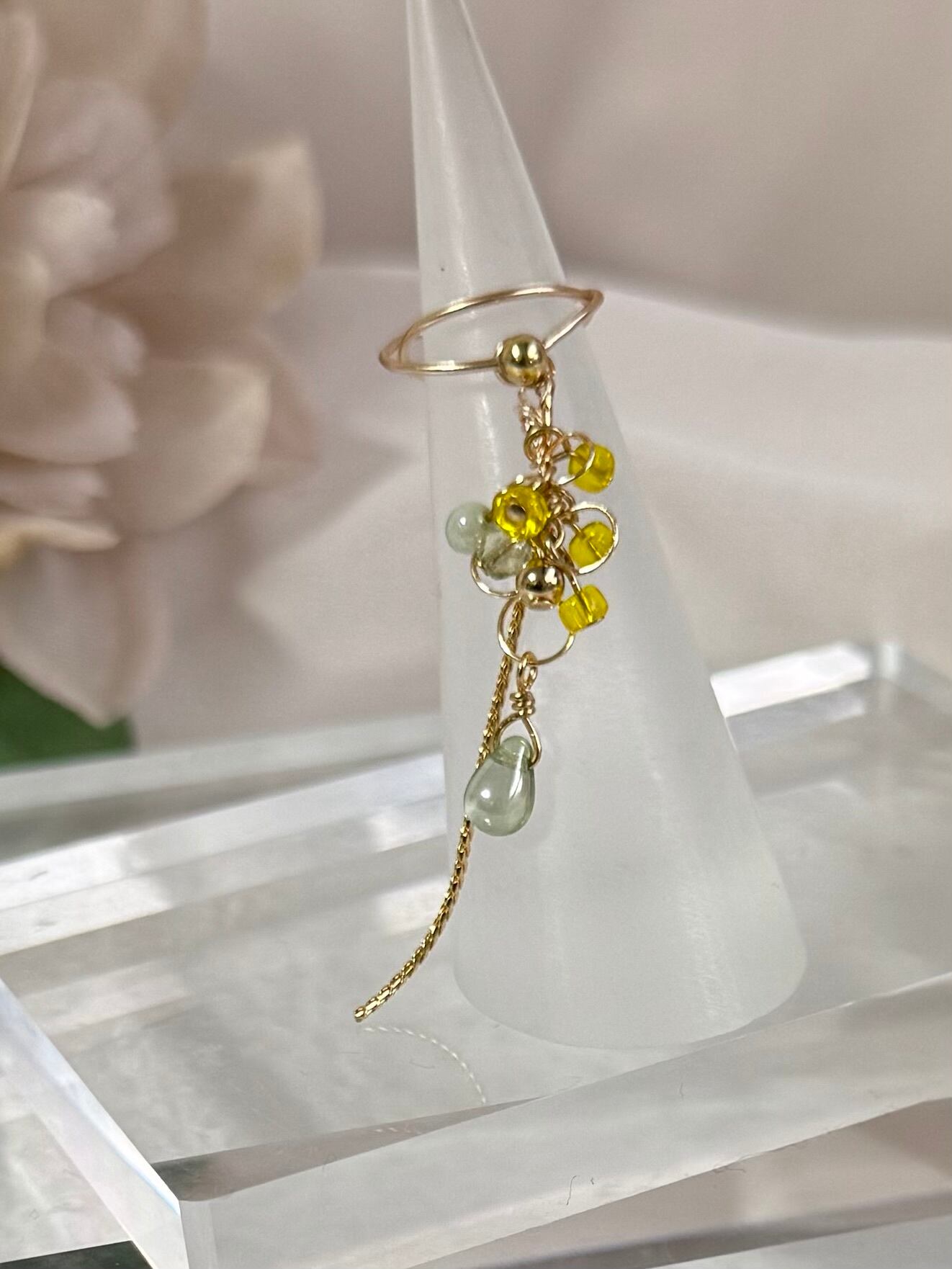 ミモザの蕾と緑の葉を一つのビジューで表現したイヤーカフ。