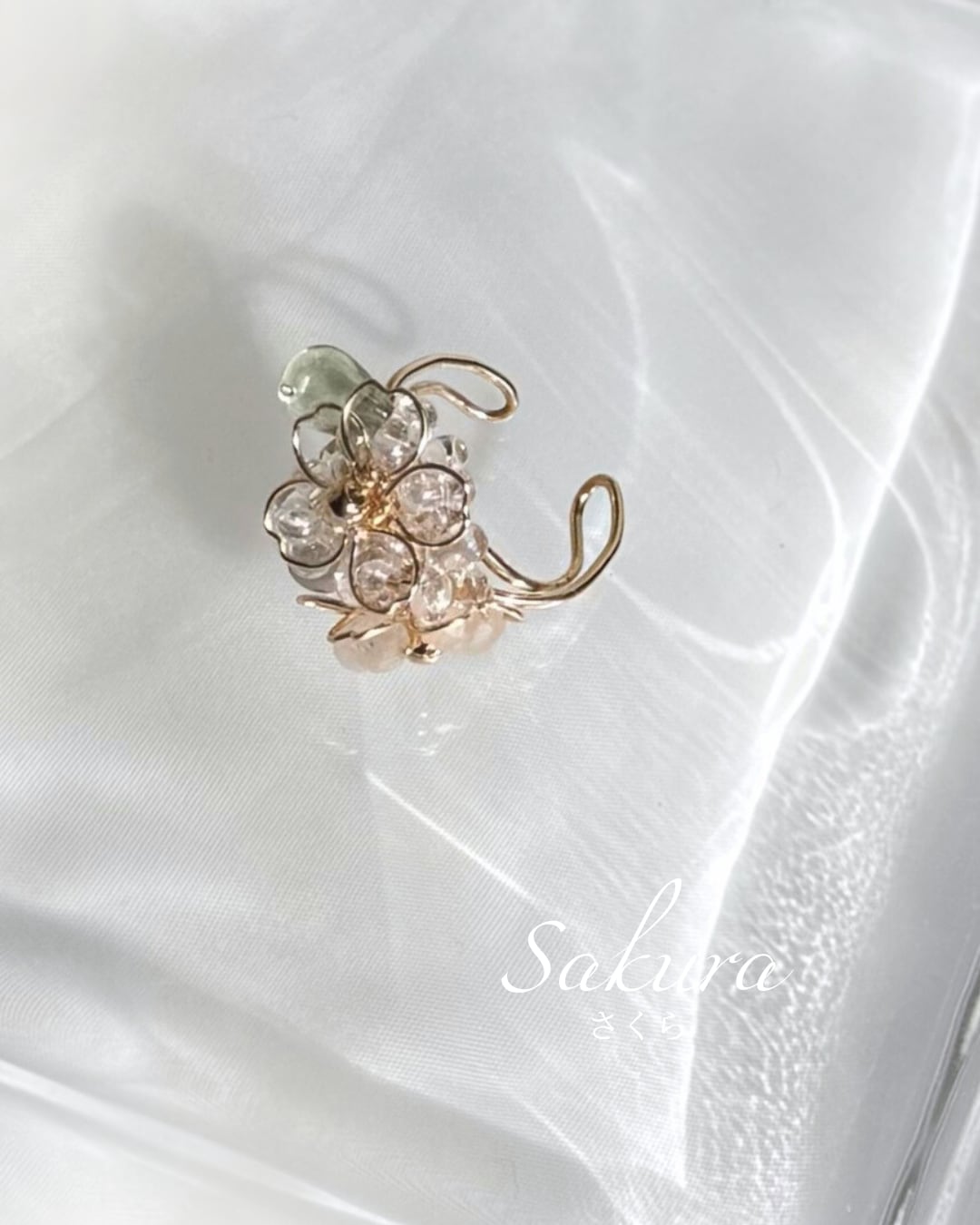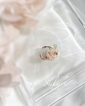 小さな桜が折り重なる様子と、新緑の緑の葉が、少し目を出す様子を一つのビジューで表現したビジューイヤーカフ。