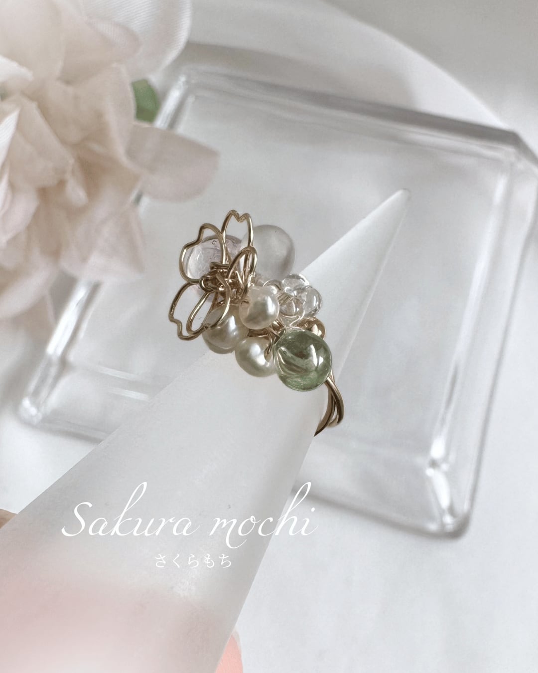 ・桜餅を包む葉はグリーンのチェコビーズで。