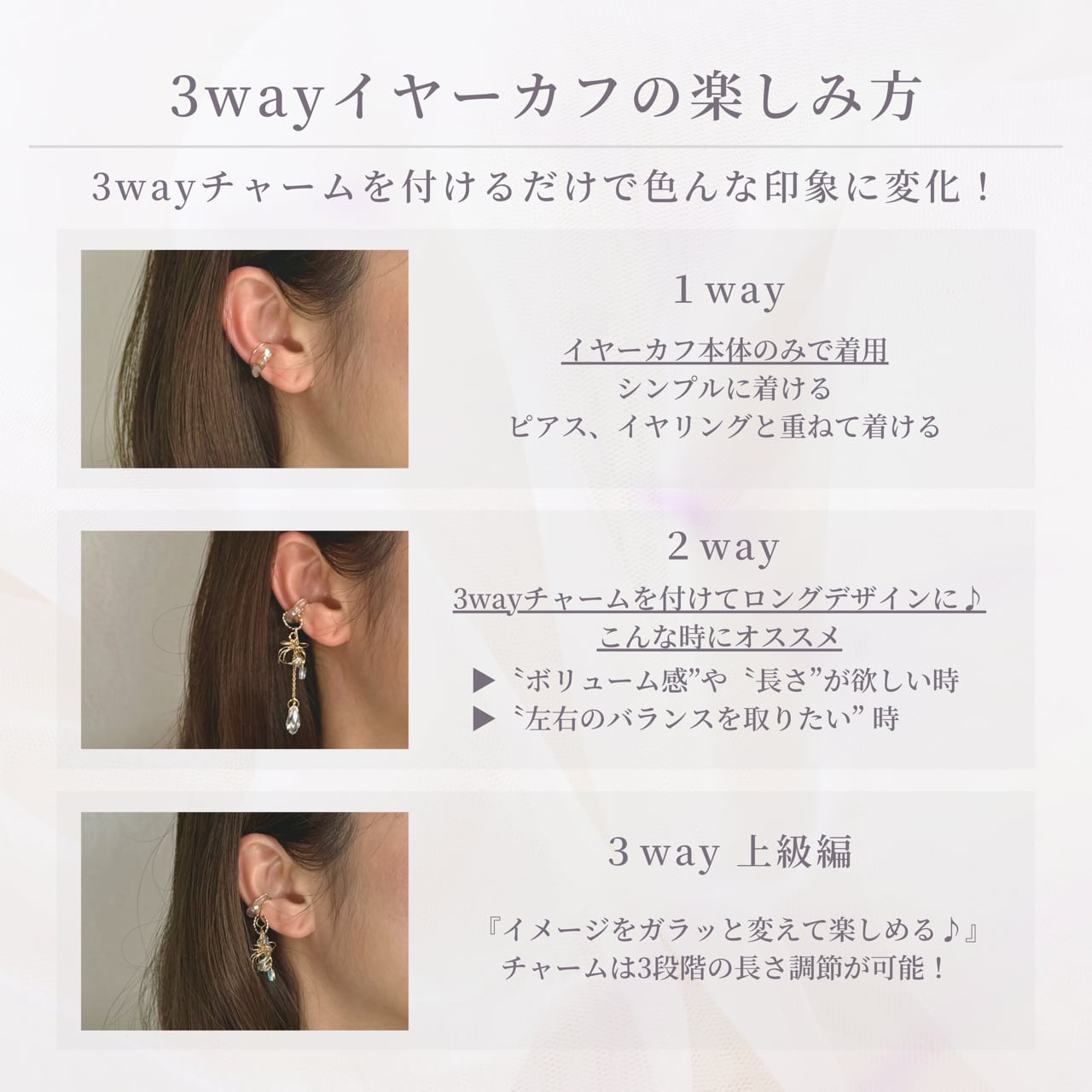 ①両面使えるイヤーカフ(別売)に取り付けると10パターン以上で着用可能です。