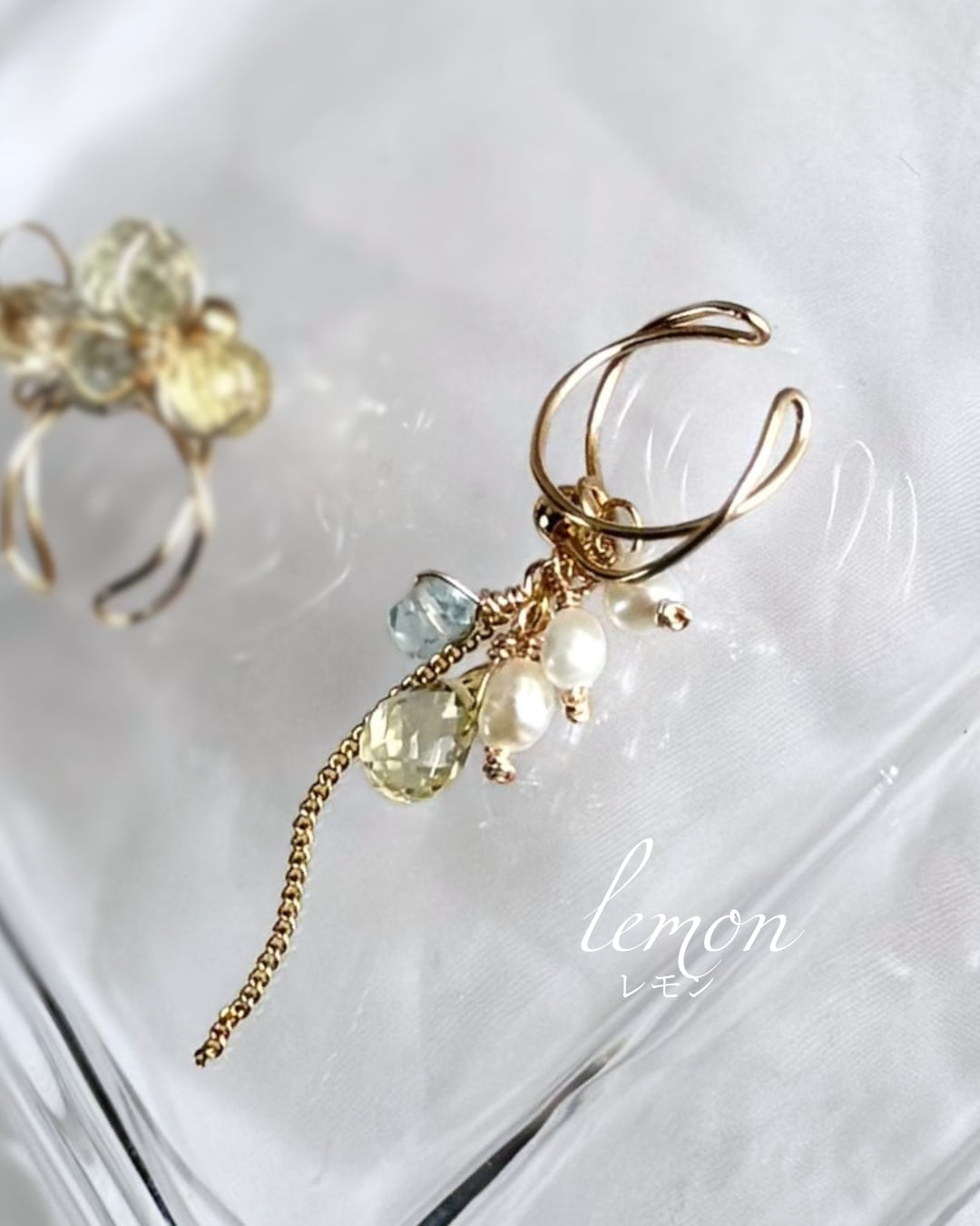 ビジューとお揃いのレモンカラーが揺れるイヤーカフ。